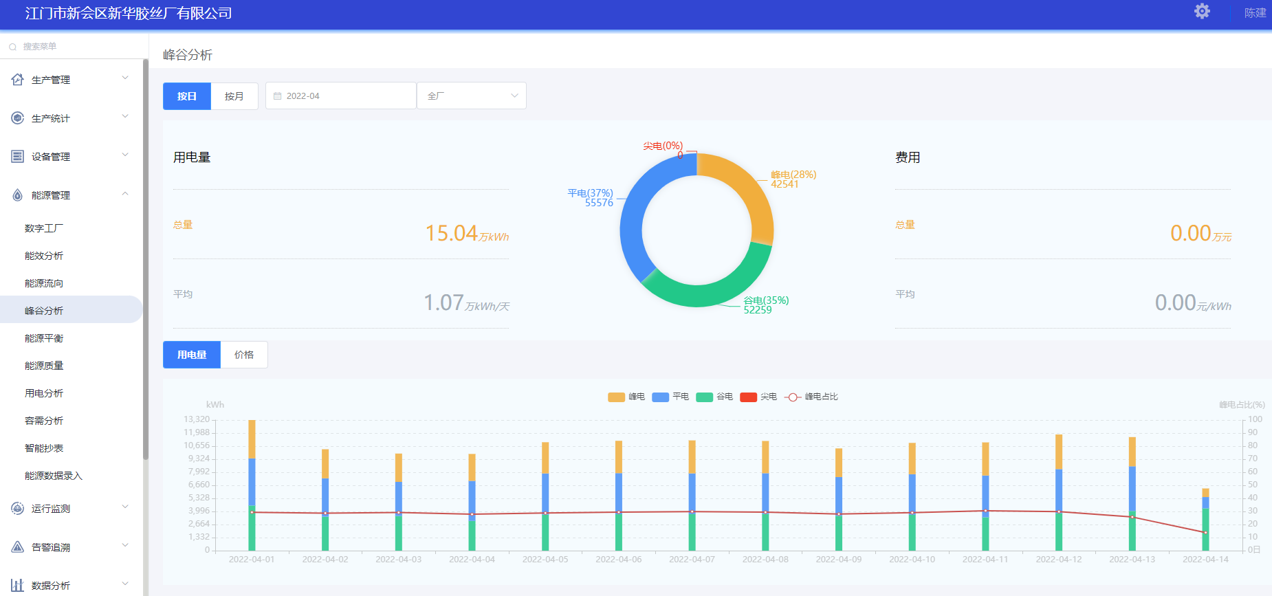 新華膠絲廠生產(chǎn)用電峰谷平數(shù)據(jù)在線監(jiān)測,反映企業(yè)錯峰用電實際狀況、錯峰用電占比情況。對企業(yè)歷史用電量及電費(錄入)進(jìn)行統(tǒng)計分析,有助于合理調(diào)度高耗能設(shè)備啟停區(qū)間,減少峰電比例,節(jié)約生產(chǎn)能源成本。展示各廠峰谷用電的實物量及占比,通過峰谷平用電比例指導(dǎo)車間及工序合理排產(chǎn),提高用電的效率和經(jīng)濟(jì)性。