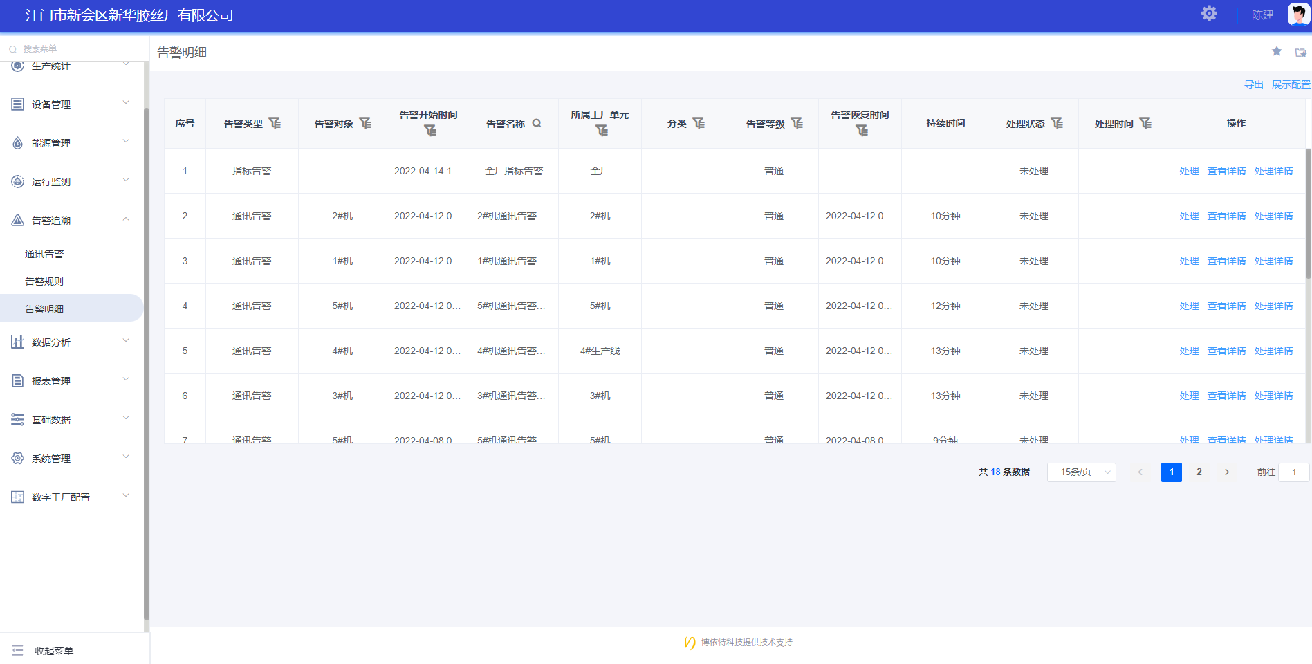 告警追溯模塊實現(xiàn)設(shè)備運行異常、能耗異常等生產(chǎn)異常實時告警與追溯。所有報警變量及其上、下限新華膠絲廠可以自定義,當(dāng)發(fā)生異常時,對應(yīng)的工段或者設(shè)備以閃爍、改變顏色或發(fā)短信等告警形式提醒相關(guān)人員。告警晴雨表以廠區(qū)拓?fù)鋱D(工廠模型)的形式直觀展示,告警類型包括通訊告警、指標(biāo)告警、參數(shù)告警。